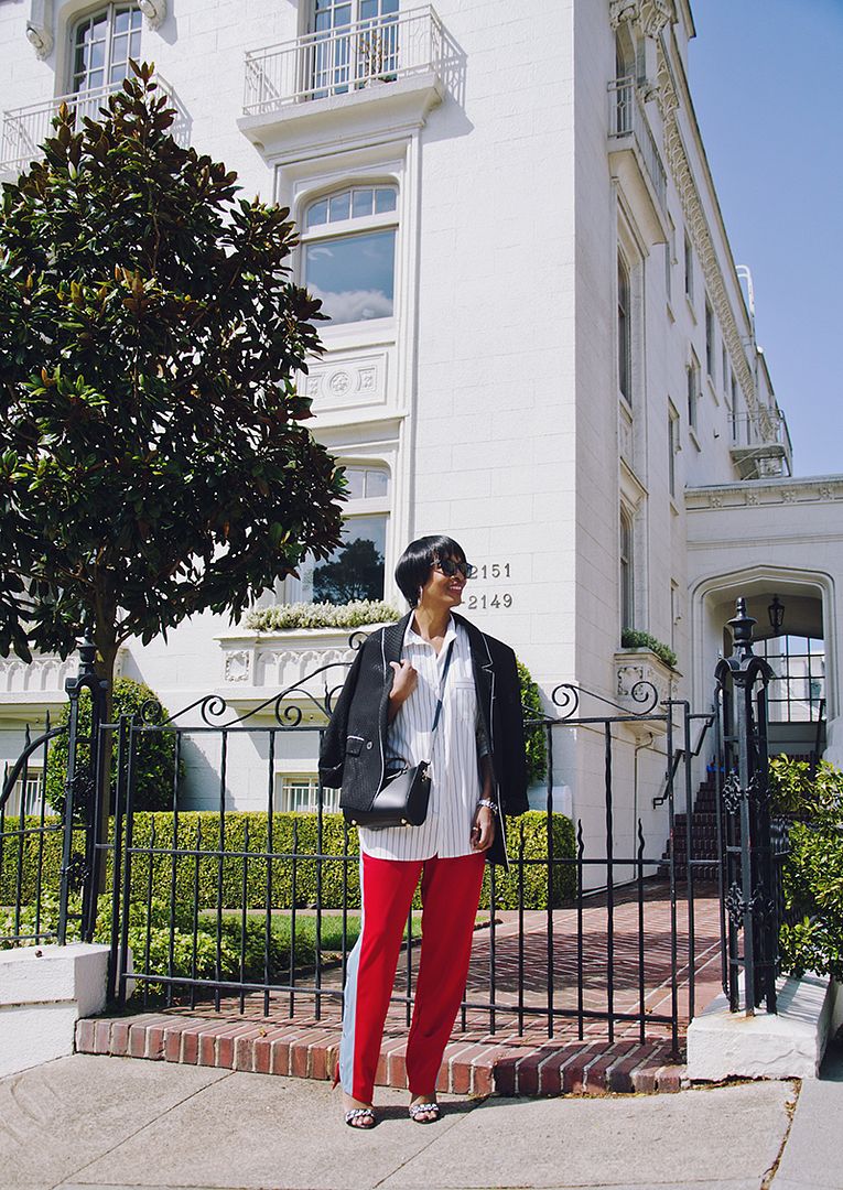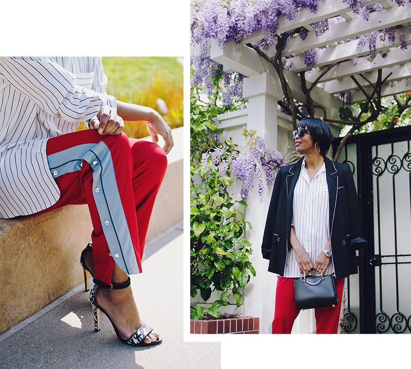 i’ve been into the track pants as pants trend for a while, but it’s taken me a while to find the right pair (other than my favorite black elastic ankle pair). after spotting these pants at free people, i wanted to give a more literal approach to the trend a shot and i’m kind of in love. my inseam is on the shorter side, so i was concerned these would be too long, but they aren’t with a 3 1/2″ heel. i’m digging the contrast side panel with the curved hem and snap detail, which adds a bit of polish. to add more visual interest, i’ve added a longer, striped tunic and an old pajama blazer from zara that has a subtle dot texture and also has piping to mimic the pants.