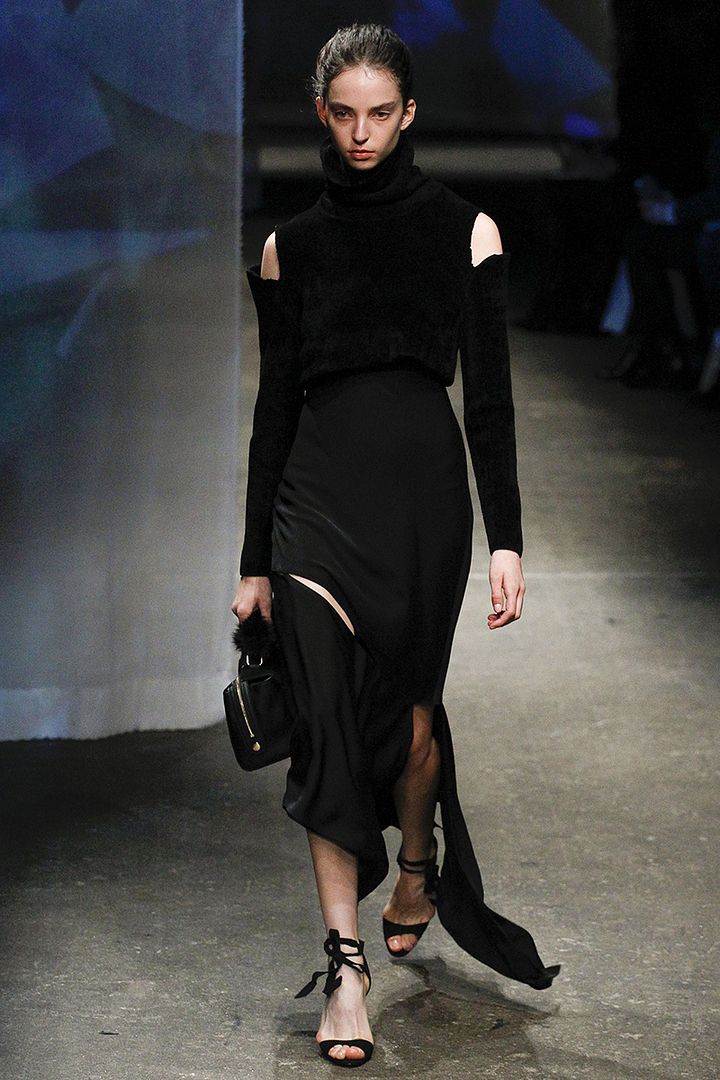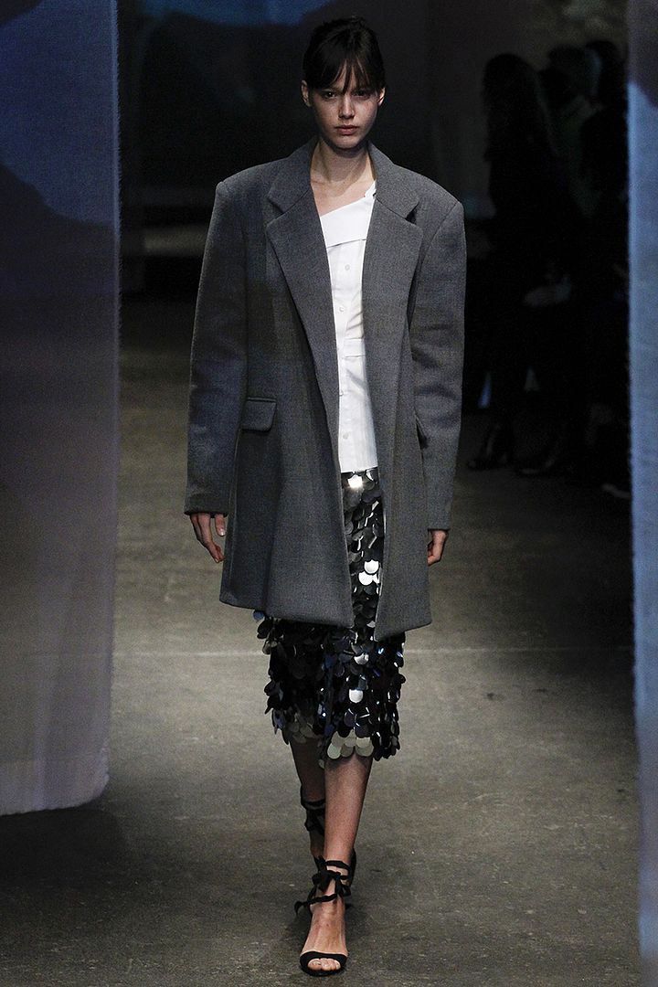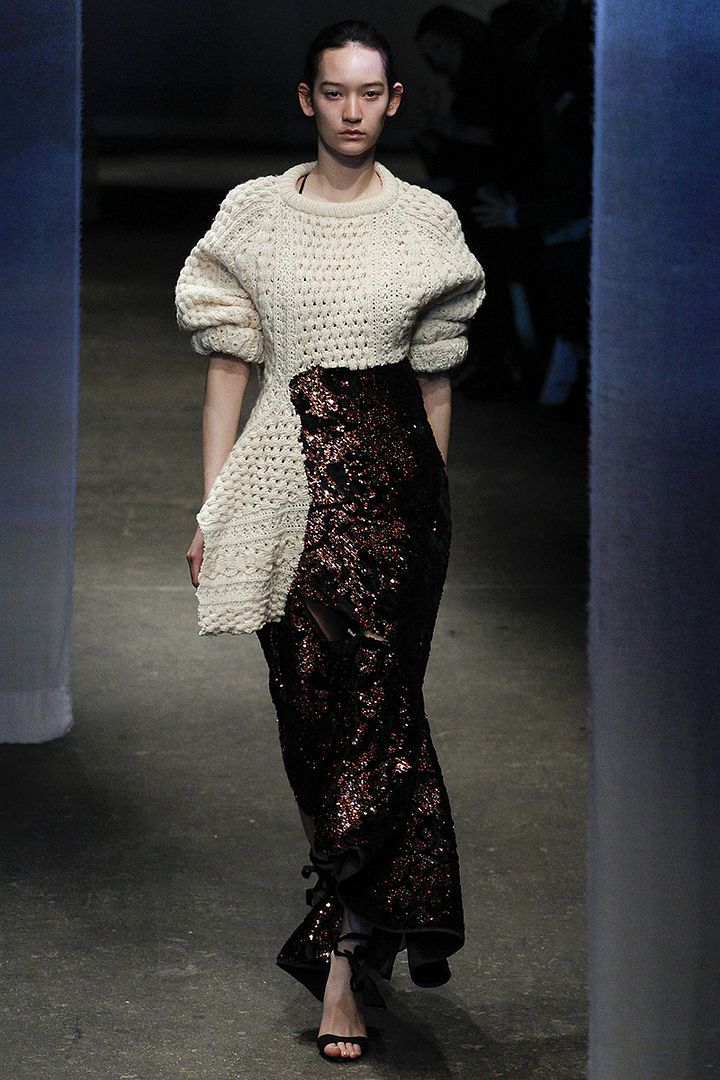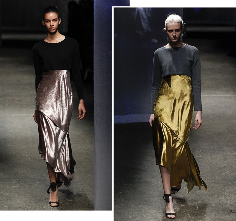 the theme of the milly show was “fractured,” and given the state of affairs in our country right now, that seems appropriate. but in looking at the clothes, there was a sliver of optimism in all the sequins and shine. the collection had a 90s grunge feeling to it, but in a sophisticated way—slip dresses paired with cropped sweaters, unique layering, a men’s button down worn backwards. it was about taking what you’ve been given, or what you have, and making do or making something better out of it. also, wearing a deconstructed fisherman sweater over a long beaded gown is brilliant, and showing some skin in unexpected places is even more sexy.