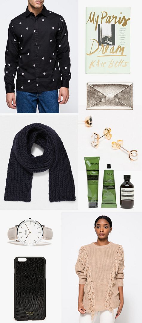 my paris dream by kate betts / i ro see seamless long walletbing bang stud trio / men’s aesop cepheus trio / farrow chronicle fringe sweater / vianel lizard iphone case / cluse la bohéme silver and gray watch / wool and the gang whistler scarf / cheap monday air shirt in spiral dot