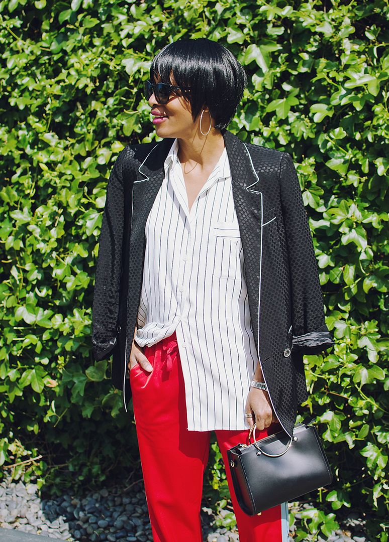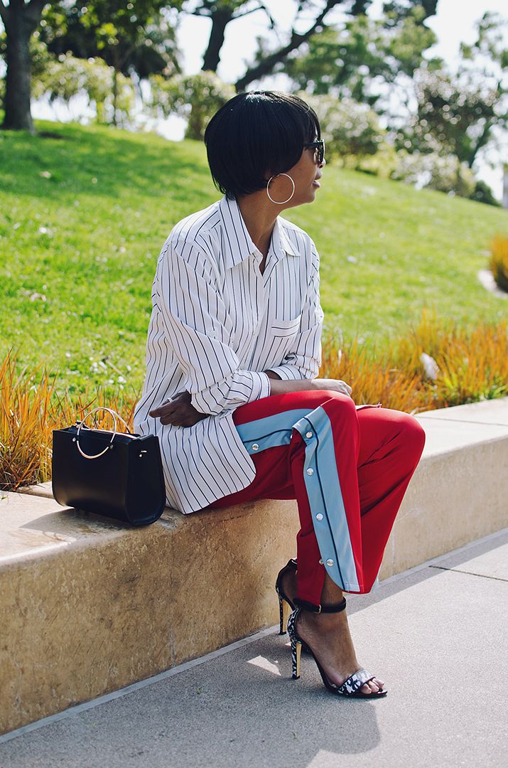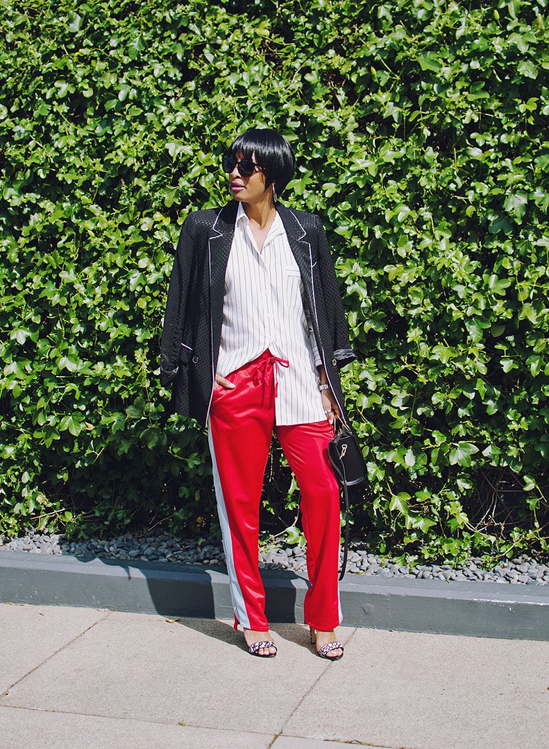 i’ve been into the track pants as pants trend for a while, but it’s taken me a while to find the right pair (other than my favorite black elastic ankle pair). after spotting these pants at free people, i wanted to give a more literal approach to the trend a shot and i’m kind of in love. my inseam is on the shorter side, so i was concerned these would be too long, but they aren’t with a 3 1/2″ heel. i’m digging the contrast side panel with the curved hem and snap detail, which adds a bit of polish. to add more visual interest, i’ve added a longer, striped tunic and an old pajama blazer from zara that has a subtle dot texture and also has piping to mimic the pants.