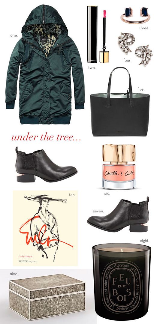 1. scotch & soda long aviator jacket / 2. chanel rouge allure gloss in seduction / 3. mirlo tate black sapphire double baguette ring / 4. ben-amun crystal fan earrings / 5. mansur gavriel small tote in black/argento / 6. smith & cult nail lacquer in ghost edit / 7. alexander wang kori bootie / 8. diptyque feu de bois colored candle / 9. west elm charcoal faux shagreen box / 10. joe eula: master of twentieth century fashion illustration by cathy horyn