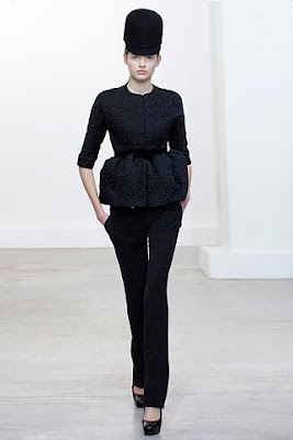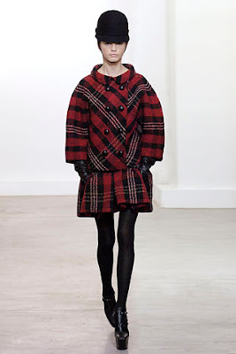 the coccoon shape that showed up at marc jacobs, donna karan, etc. (and last season in gold embroidered dresses) and create double breasted coats, cropped collarless jackets and silver toggle jackets worn with black tights, platform boots, and pleated short (short) skirts in plaids and tiny houndstooth.