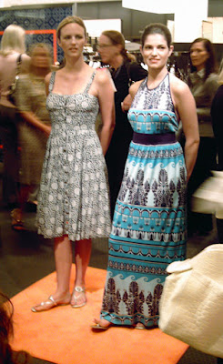 she’s also upped her evening/cocktail wear options, after a sequin t-dress she designed showed up on hilary duff and catherine zeta-jones. for summer, she’s offering a tank and short sleeve version of the dress, plus mediterranean print maxi dresses and gold brocade shifts.
