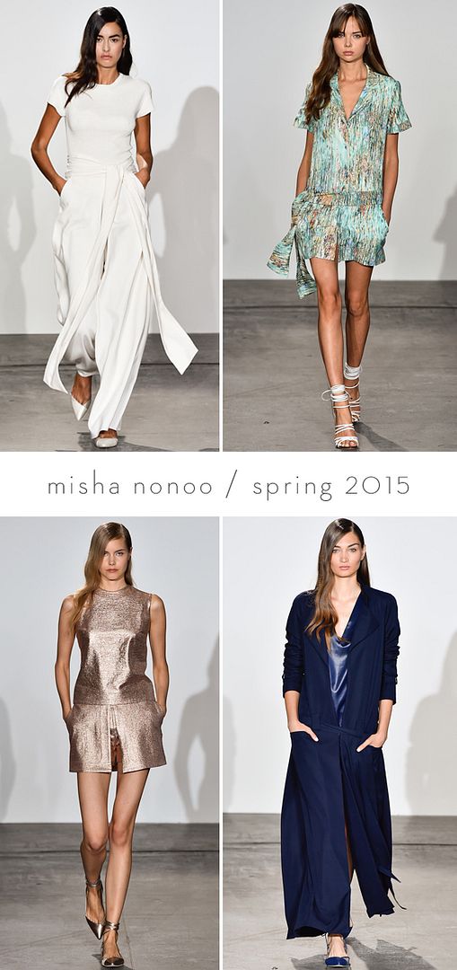 misha nonoo is a new-to-me designer but i adored her spring collection for a similar reason that i loved wes gordon’s—it felt fresh. raised by a british mother and iraqi father, she brings an interesting perspective on dressing that comes from living and experiencing different cultures, including working with artists. while the printed pieces (using images of friend dustin yellin’s sculptures) were beautiful, it was in the monochromatic looks that she excelled. duster coats, coordinated short sets, flowy crops and wide leg pants, and flirty cocktail dresses in white, navy, bronze, and fuschia were just gorgeous.