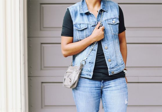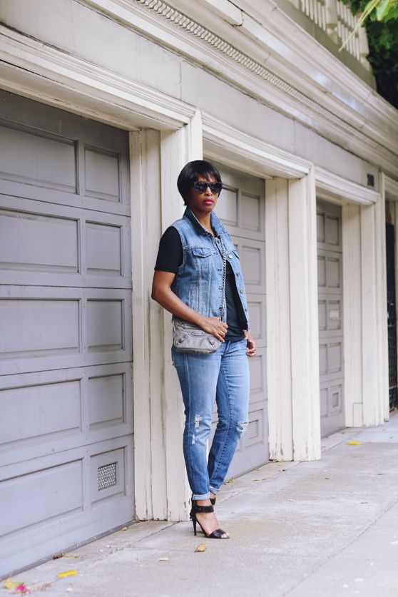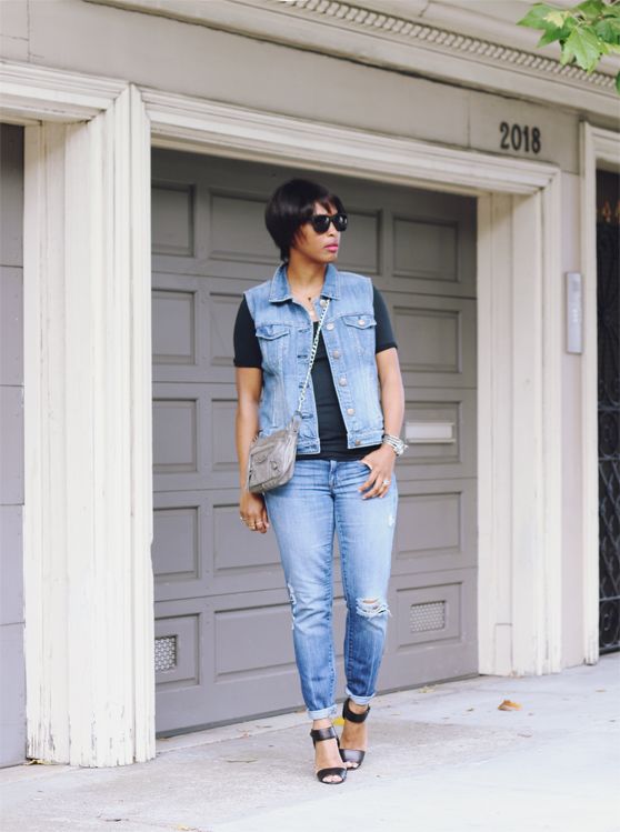 showing off a new-er way to wear denim-on-denim: an almost matching distressed vest and skinnies, a close fitting tee, and a polished sandal…