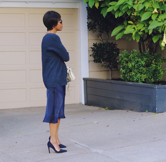 right now i’m taking it back—as in back in time—when it comes to fashion. i talked about my fall inspirations last year, and one of the looks i was obsessed with was one from michael kors that featured a slipdress over a long camel coat…so nineties calvin klein. well wearing a coat around the office isn’t exactly practical, but then again, neither is wearing a slip dress. so i solved this fashion dilemma (and made the look more modern) by topping it with an tonal oversized sweater. can’t wait to style it in other ways, like with a black or fair isle sweater or an oversized blazer.